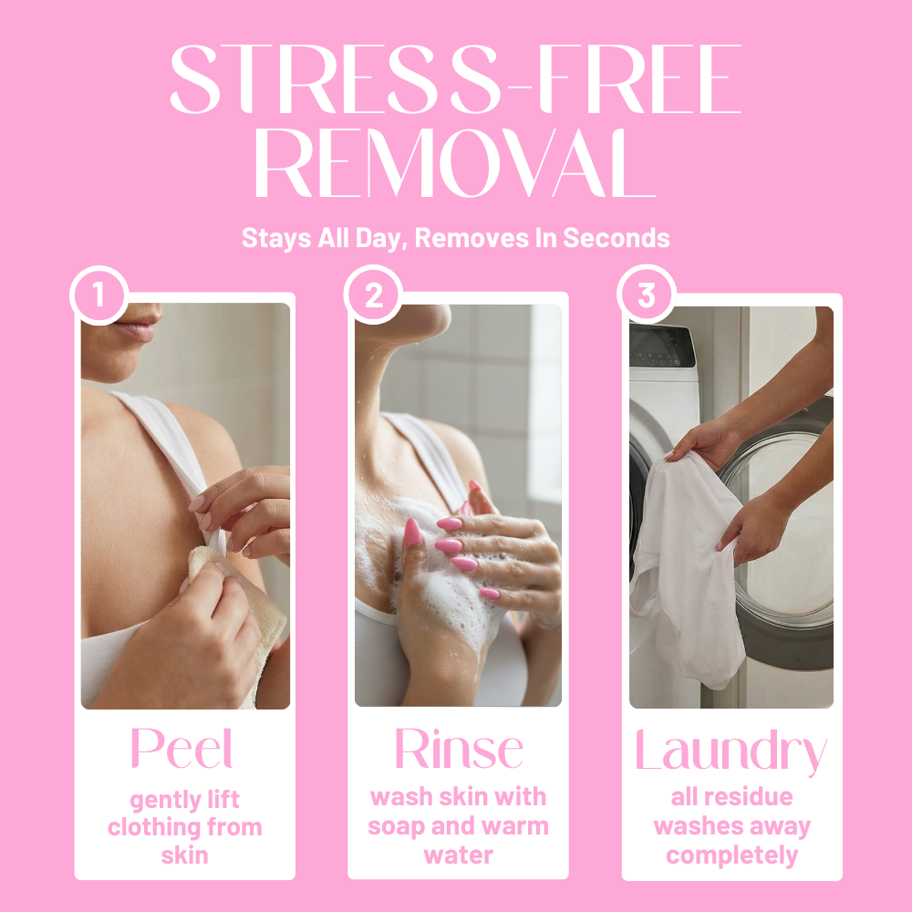 STEP 1: Gently peel the clothing from your skin. If you have sensitive skin, you can dab the clothing with warm water to begin loosening the adhesive.