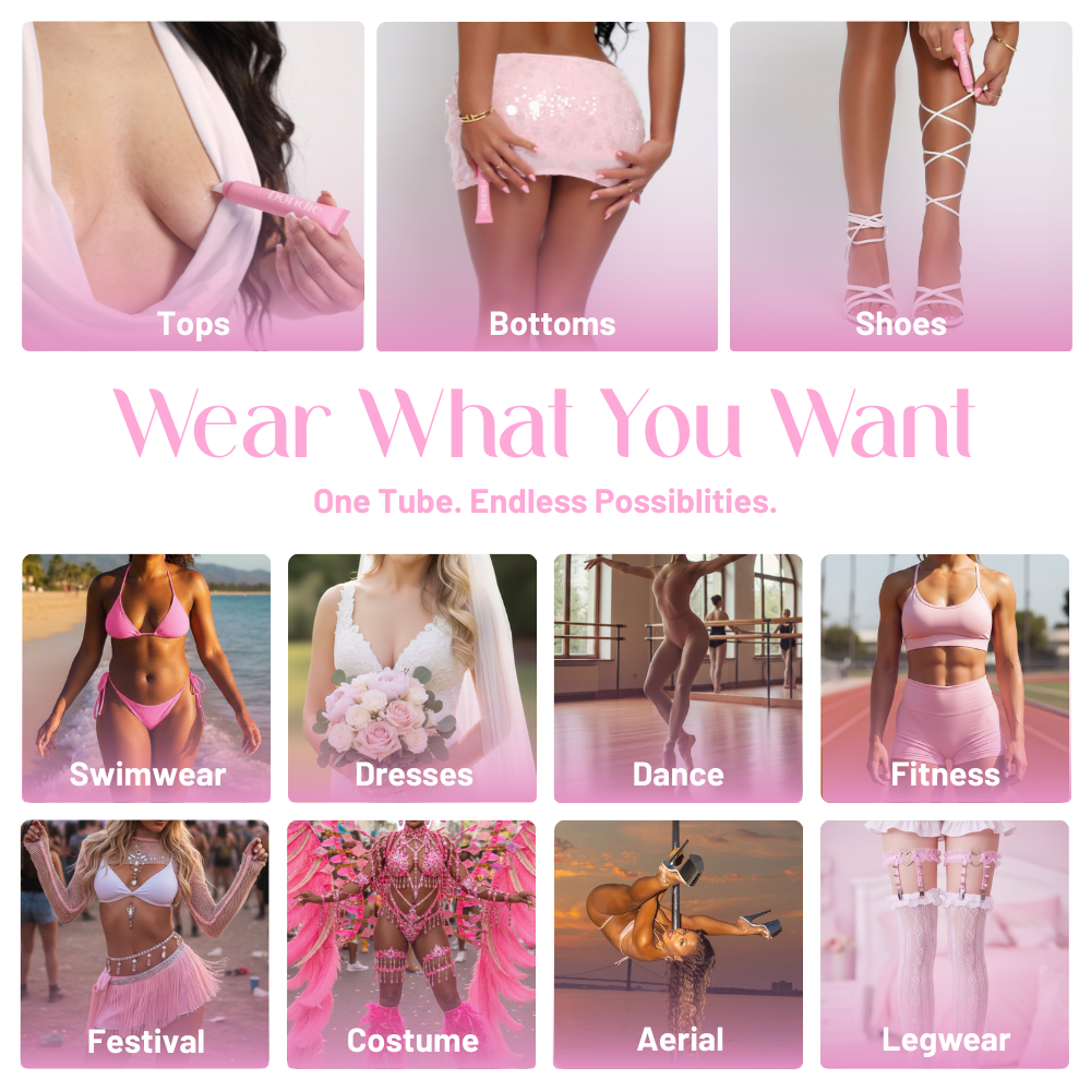 You can use Bondie™ for whatever you'd like. Its perfect for bikinis, dresses, tops, slippery straps, costumes, high socks, garters, bike shorts, etc. You name it!